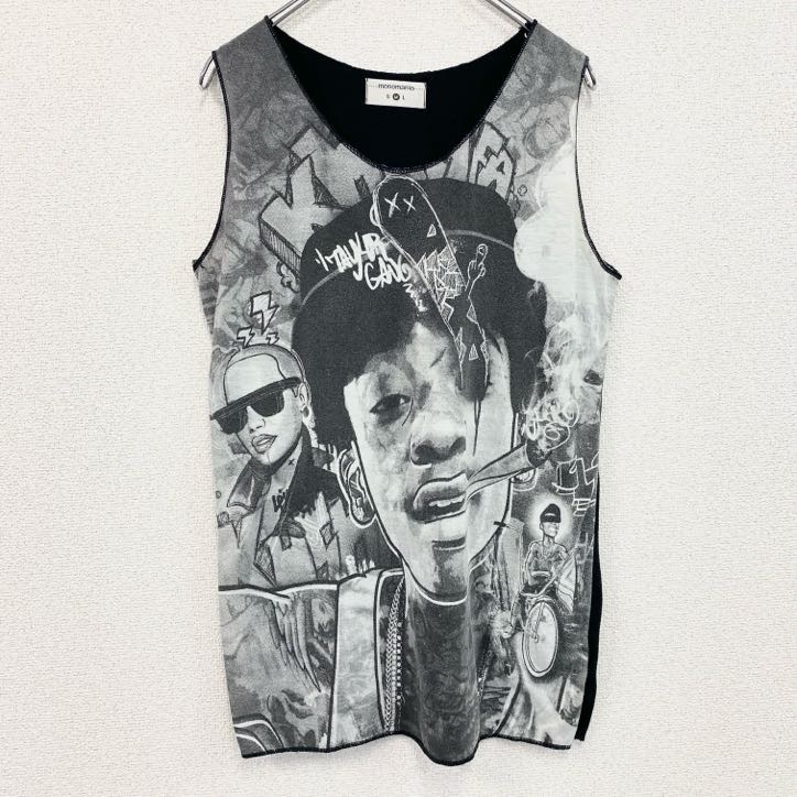 - 古着 used タンクトップ ヒップホップ ラップ 総柄 レトロデザイン クルーネック 黒 ブラック Mサイズ