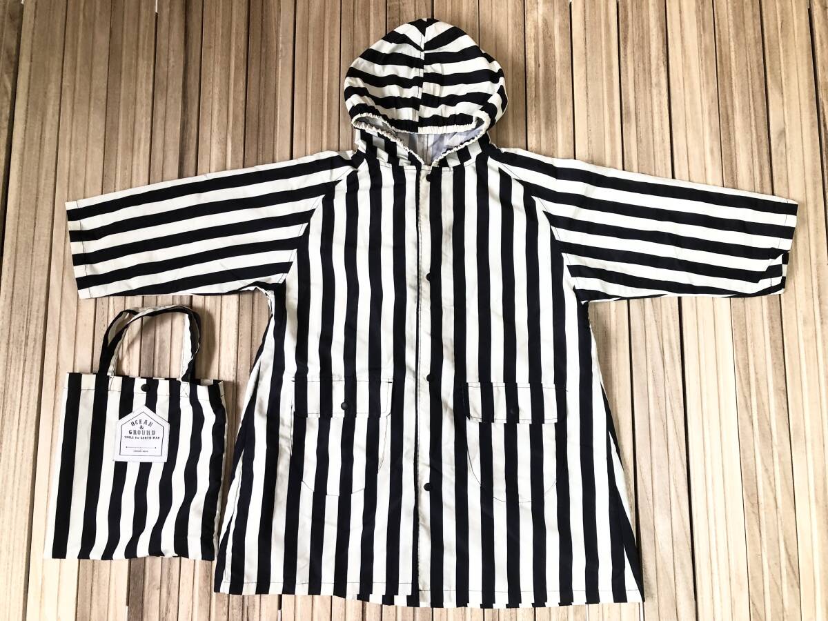 > オーシャン&グラウンド 総柄レインコート OCEAN&GROUND ストライプ 白×黒 子供服 キッズ 男女兼用 レインコート カッパ