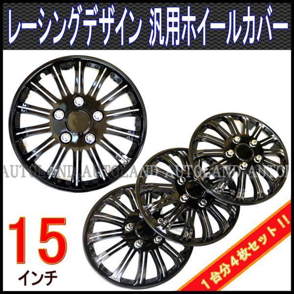 > ホイールカバー/ホイールキャップ/汎用15インチ/黒/ドレスアップレーシングアルミホイールデザイン/4枚セット/ブラックスポーク&リム