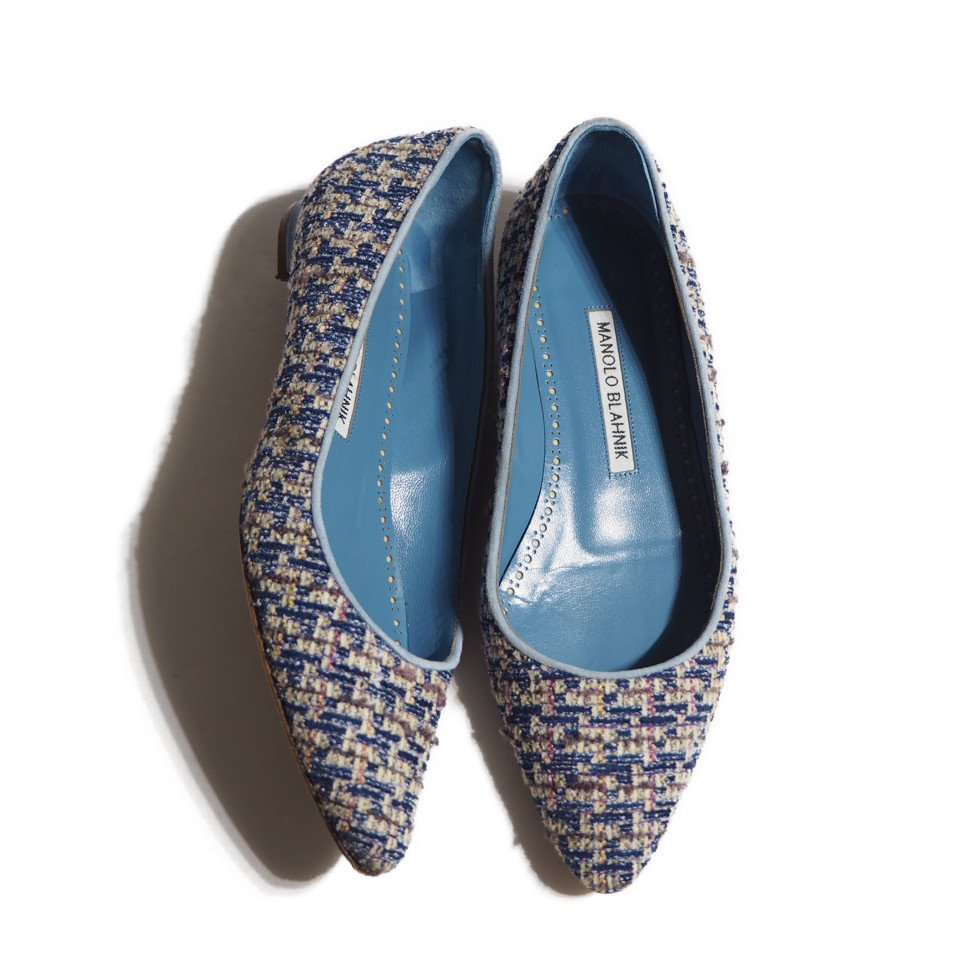 - P9417R40 ▼MANOLO BLAHNIK マノロブラニク▼ ポインテッドトゥ ツイード フラット パンプス 35/22.5cm ネイビー ブルー 秋~春