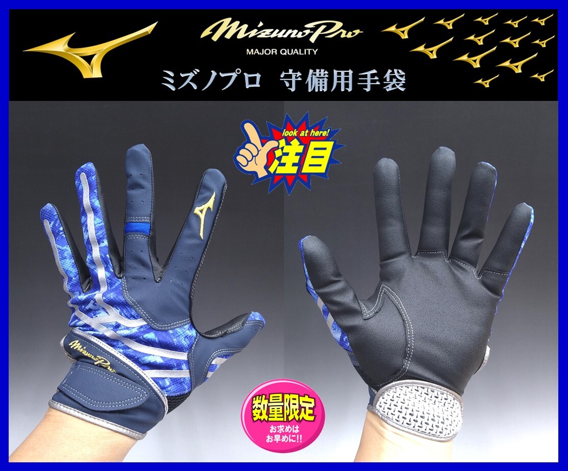 - 252◆刺繍無料◆ ミズノプロ★守備用★手袋★L (26-27cm)★ネイビー×シルバー★1EJED31014★ミズノ★パットなし 検)グラブ.グローブ