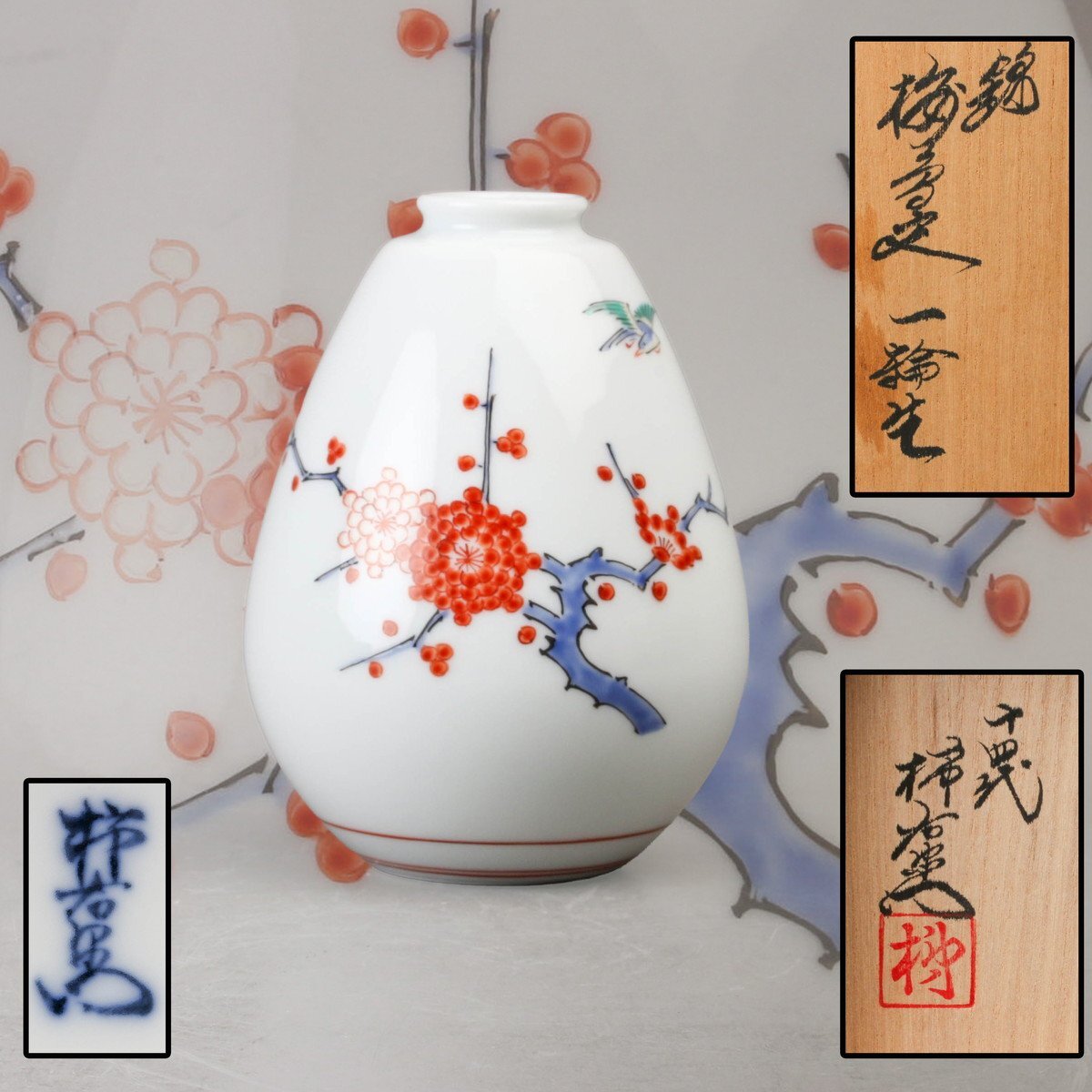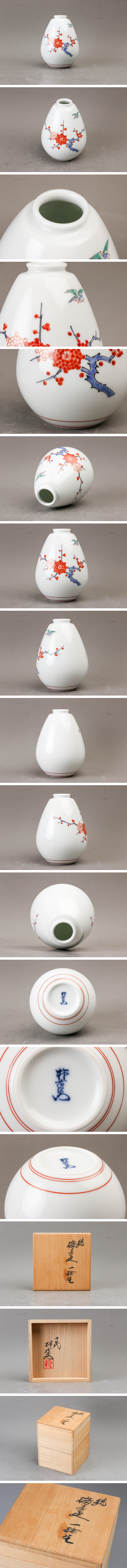 > 【SAG】人間国宝 十四代 酒井田柿右衛門 錦梅鳥文一輪生 共箱 本物保証