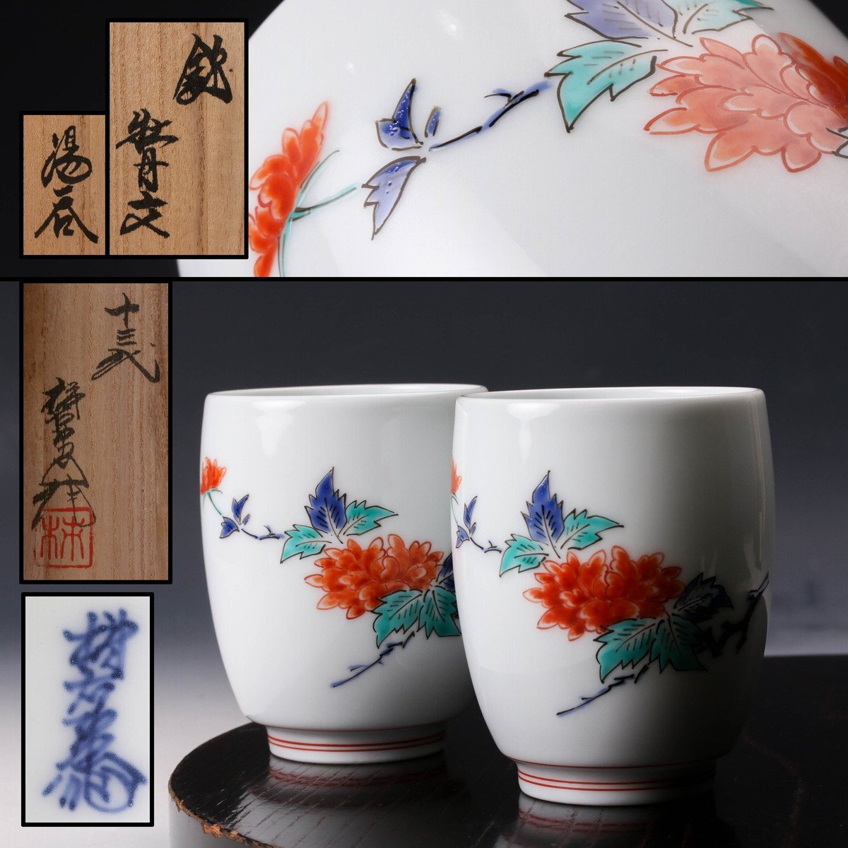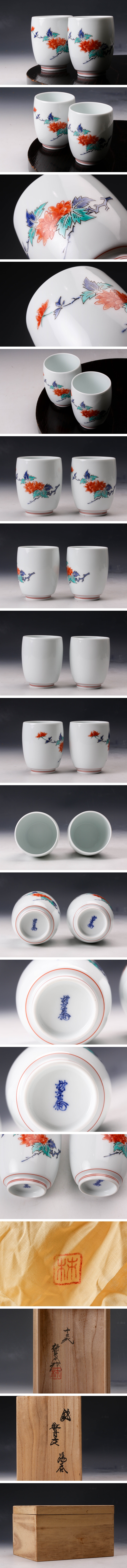 - 【佳香】十三代 酒井田柿右衛門 錦牡丹文湯呑 二客 共箱 共布 本物保証