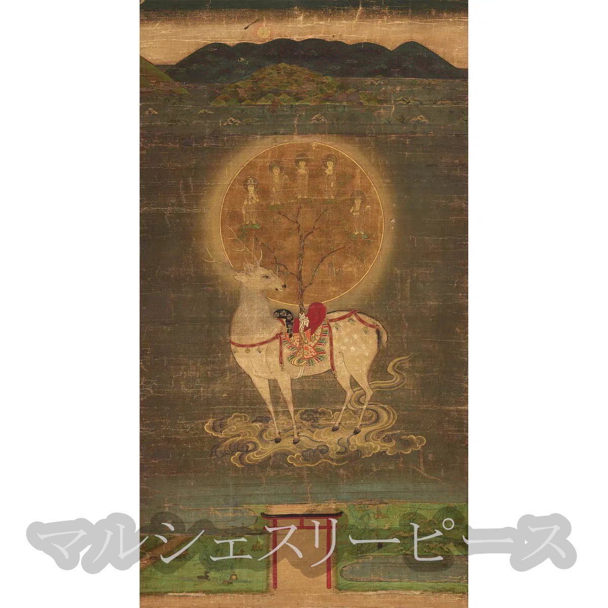 - 鎌倉時代 春日鹿 曼荼羅図 仏画 仏図 掛け軸 画芯 未表装