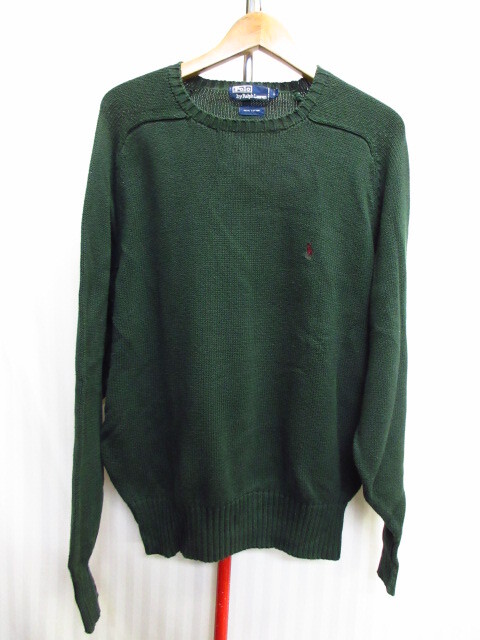 - ラルフローレン 90sヴィンテージ ロゴ刺繍ニット メンズL 緑系 コットンセーター クルーネック ニットセーター ニットトレーナー10173