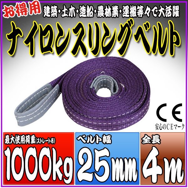 > スリングベルト 4m 幅25mm 使用荷重1000kg 1t 1.0t 吊りベルト ベルトスリング [ナイロンスリング 吊上げ ロープ 牽引 運搬]