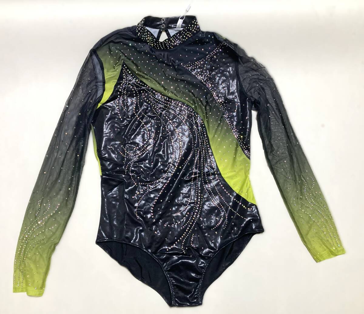 - 特大2XLサイズ 黒黄/IEFIEL社製 長袖フィギュアスケートレオタードクリスタルラインストーンボディスーツバレエ体操ダンス ウエア