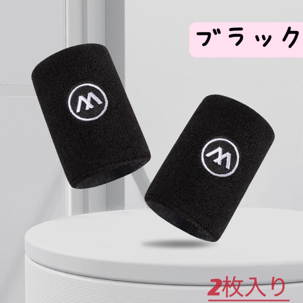 - 再入荷 刺繍リストバンド 吸汗速乾抗菌防臭 手首スポーツバンド 汗止め 男女兼用 野球 ブラック2枚入り