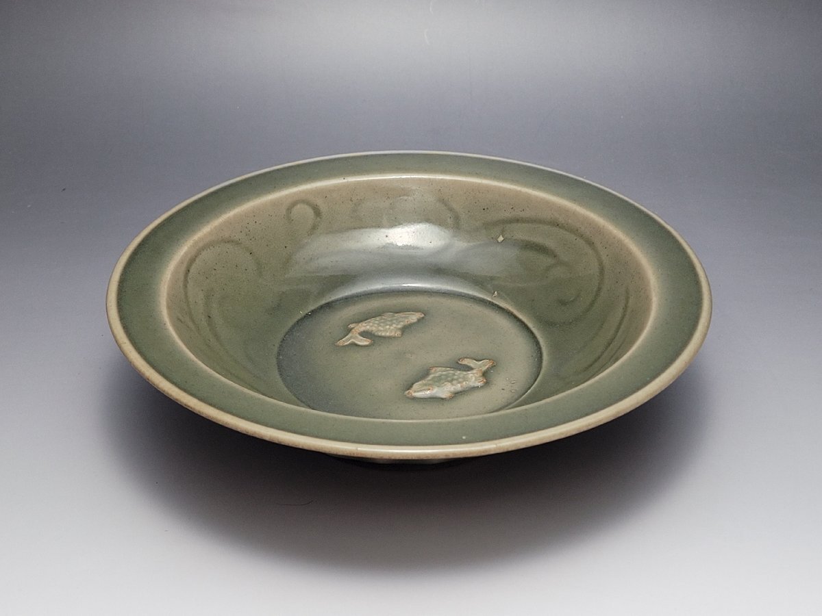 > 青磁 陽刻 魚紋 皿 時代唐物 幅約21.4cm / 宋元時代 盤 皿 手塩皿 浅盤 陶瓷器 唐物 人間国宝 李朝 高麗 古玩 古董