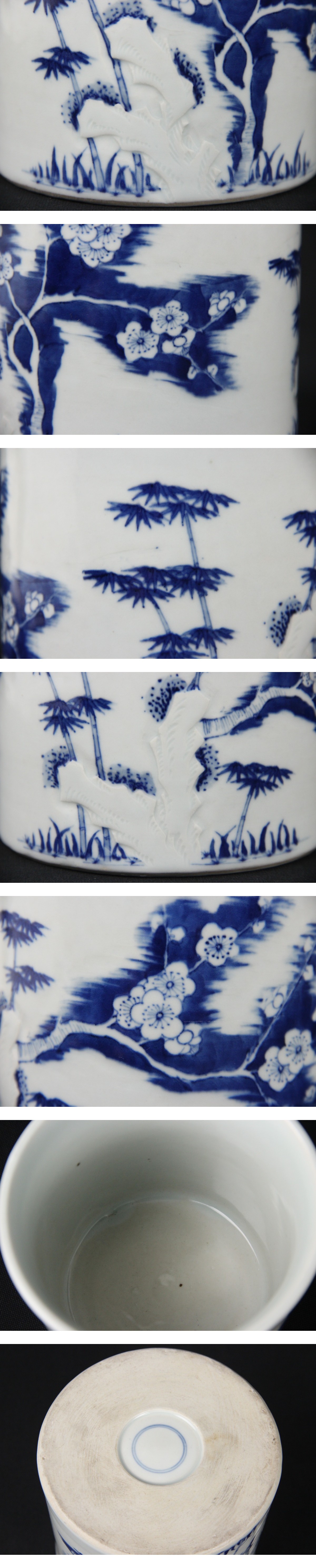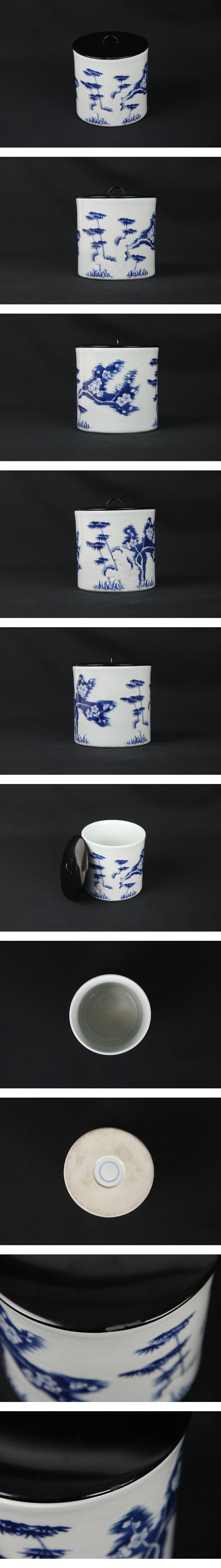- 中国景徳鎮製 染付浮彫松竹梅文 水指 黒塗蓋付 茶道具 Eo21-20