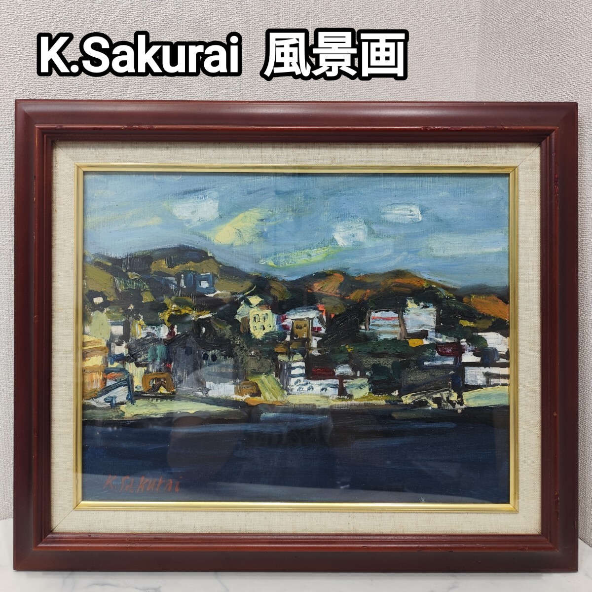 > K.Sakurai サイン 風景画 海辺の街 美術品 芸術 絵画 インテリア 木製装飾額 アート 油彩 額装 額縁 油絵