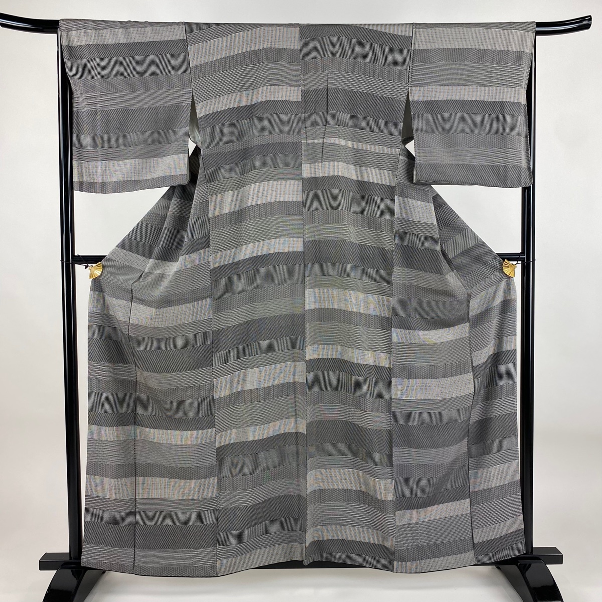 > 江戸小紋 身丈159.5cm 裄丈66cm M 袷 段縞 寄せ柄 黒灰 正絹 秀品 【中古】