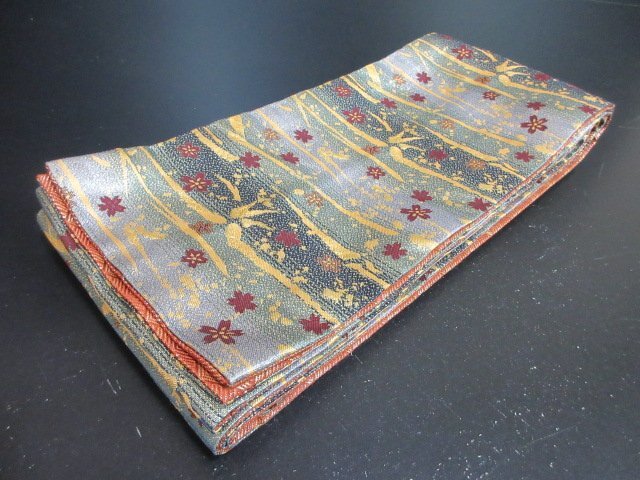 - 1円 良品 半幅帯 絹 化繊 和装 和服 リバーシブル 草花 縞 菱 お洒落 和装小物 長さ454cm【夢職】★