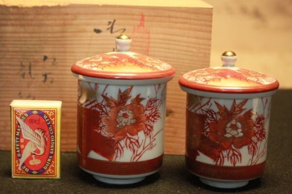- 【新品未使用】★美品 贈答品『九谷焼 龍仙 赤絵孔雀牡丹文夫婦湯呑 1組』★検:(初だし/陶磁器/昭和/レトロ/めおと/当時物)60530F