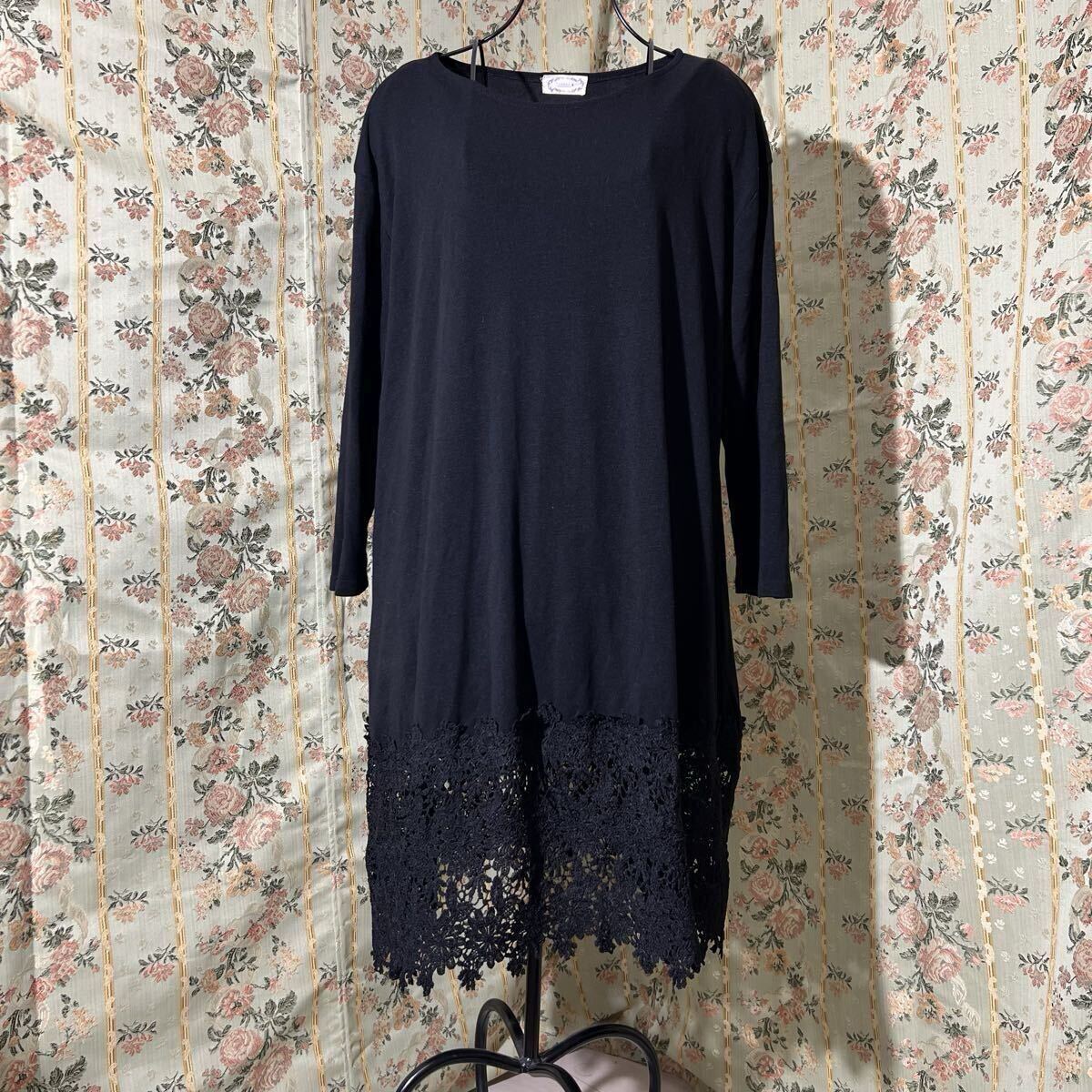 - 【cawaii】レース裾 長袖チュニック ワンピース ブラック レディース 大人可愛い ゆったりサイズ フリーサイズ 大きいサイズ 重ね着