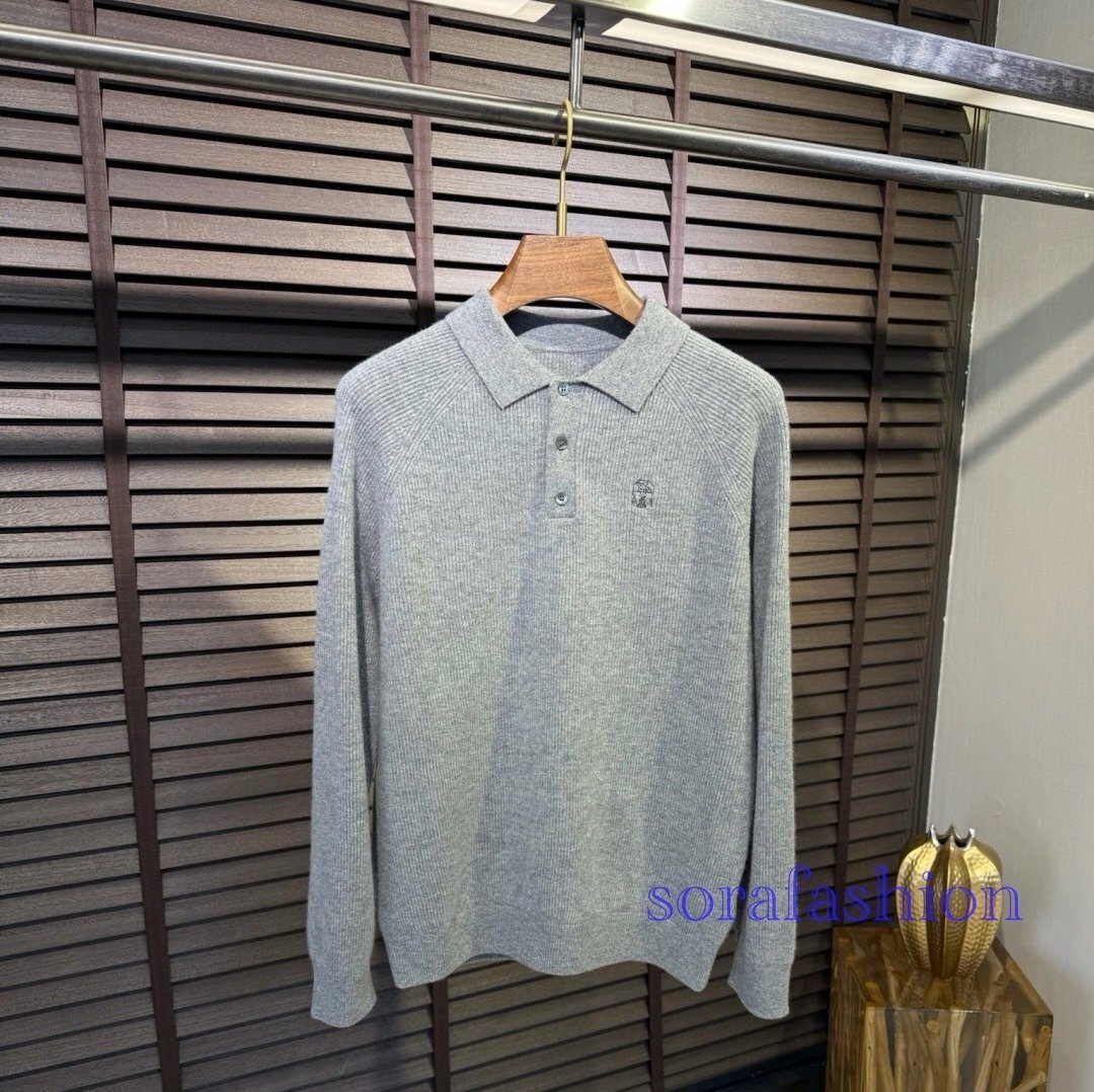 > BRUNELLO CUCINELLI ブルネロ クチネリ メンズニットポロT-シャツ ニットセーター グレー Lサイズ トップス 紳士服 ウール 長袖T-シャツ
