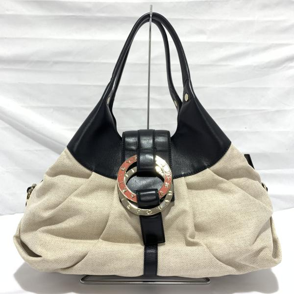 - 【中古】BVLGARI チャンドラ キャンバス レザー ヘリンボーン ダブルリング バッグ ブラック/アイボリー ブルガリ[240019510684]