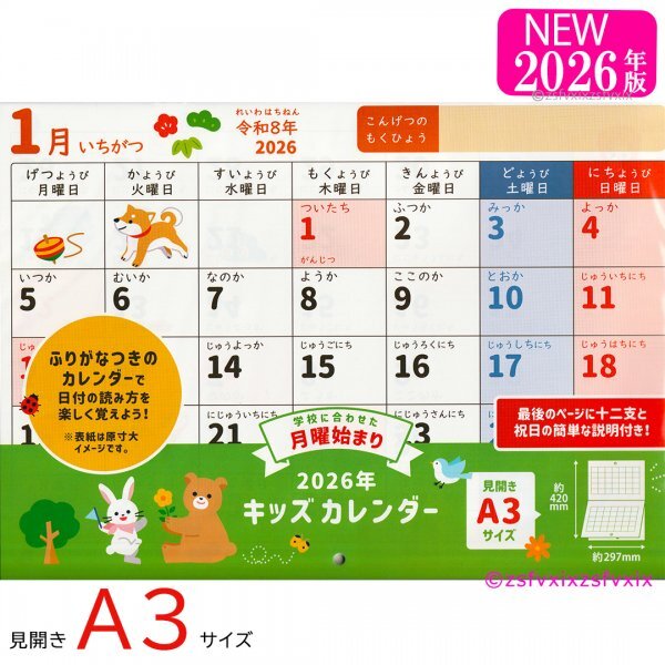 > ◆キッズカレンダー 2026年 ふりがな付き 壁掛け 月曜始まり 令和8年 A3見開き 保育園 幼稚園 小学校 子供 匿名配送 新品 干支