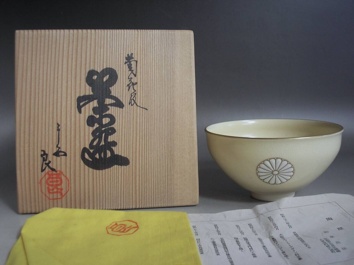 > 京焼 【和泉良法】作 <白天目 菊花紋 茶碗> 「総本山」「金剛峯寺」在印 共箱 共布 陶歴 美品