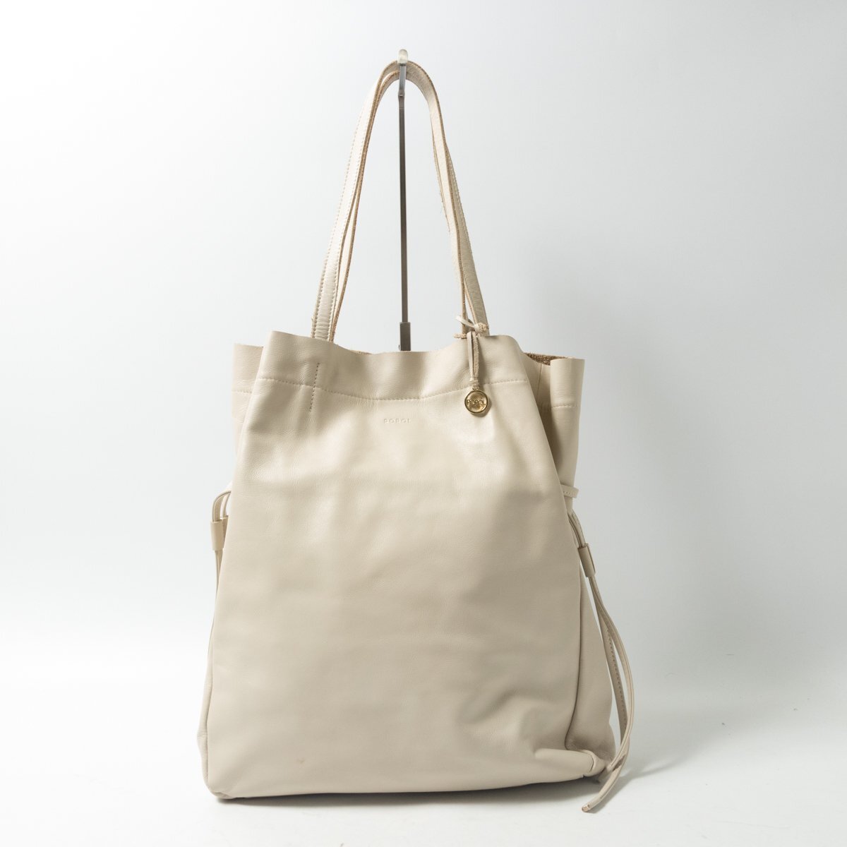 > 【1円スタート】 ROROL ロロル トートバッグ 巾着 マグネット開閉 レザー オフホワイト ロゴ型押し シンプル 無地 レディース 女性 鞄 bag