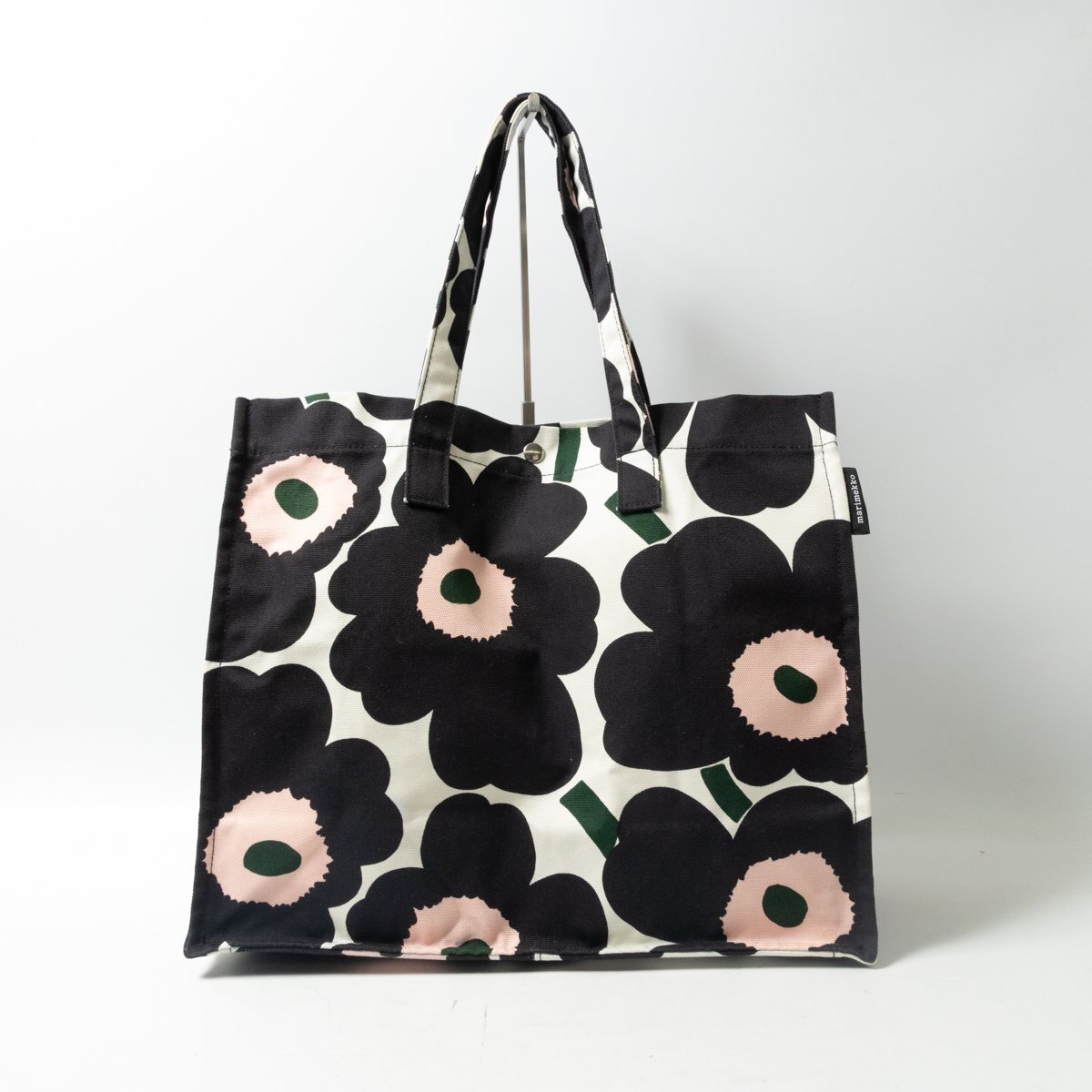 - 【1円スタート】 marimekko マリメッコ トートバッグ 肩掛け スナップボタン開閉 キャンバス 花柄 大容量 ネイビー レディース 女性 鞄 bag