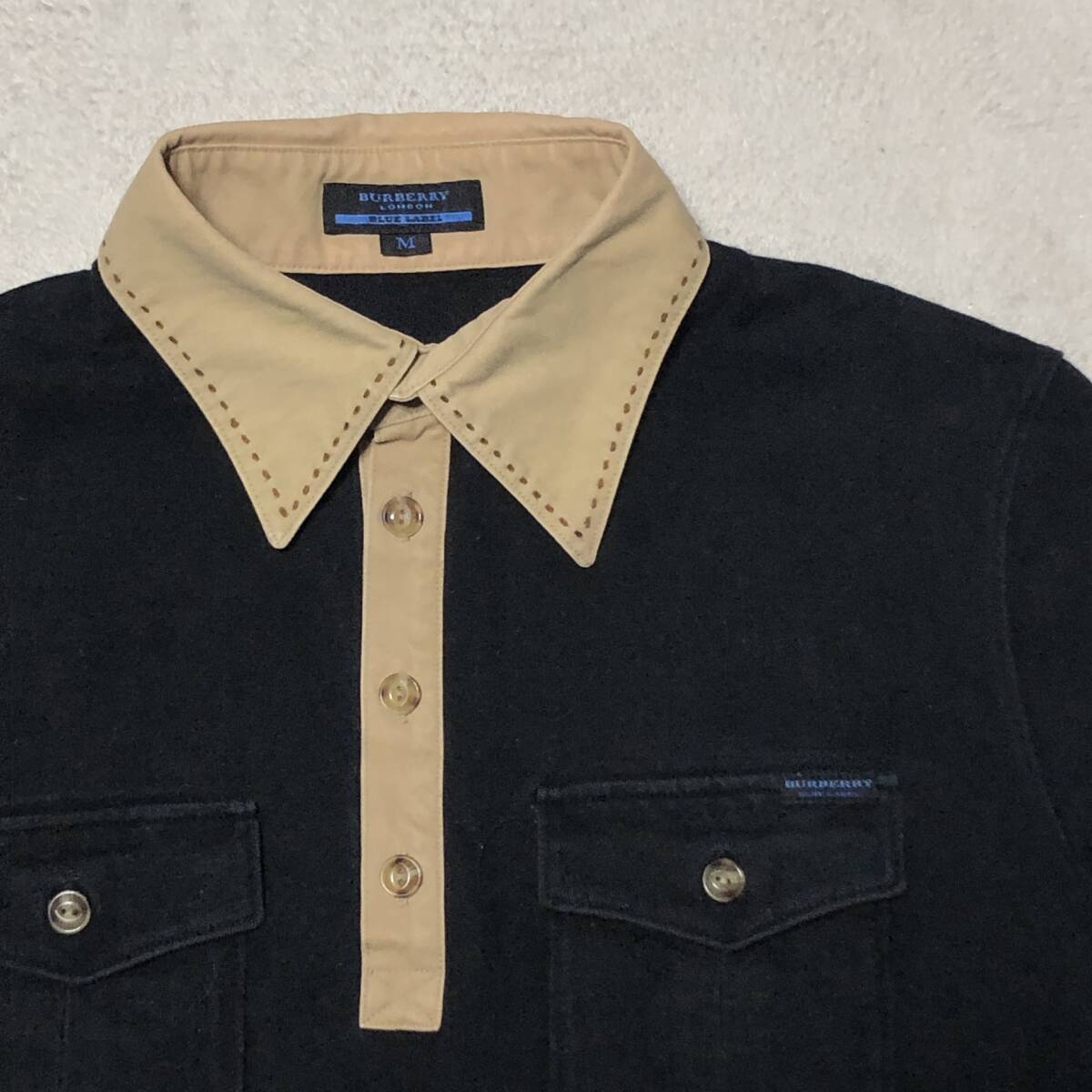 - BURBERRY BLUE LABEL バーバリーブルーレーベル 半袖ポロシャツ ホースロゴ刺 襟切り替え ブラック メンズMサイズ