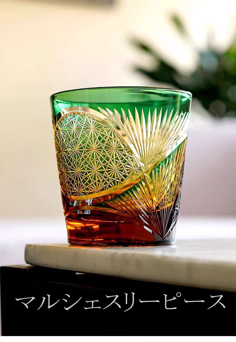 - 鶴羽紋手彫り切子クリスタルグラス - ウイスキーカップ 緑琥珀色