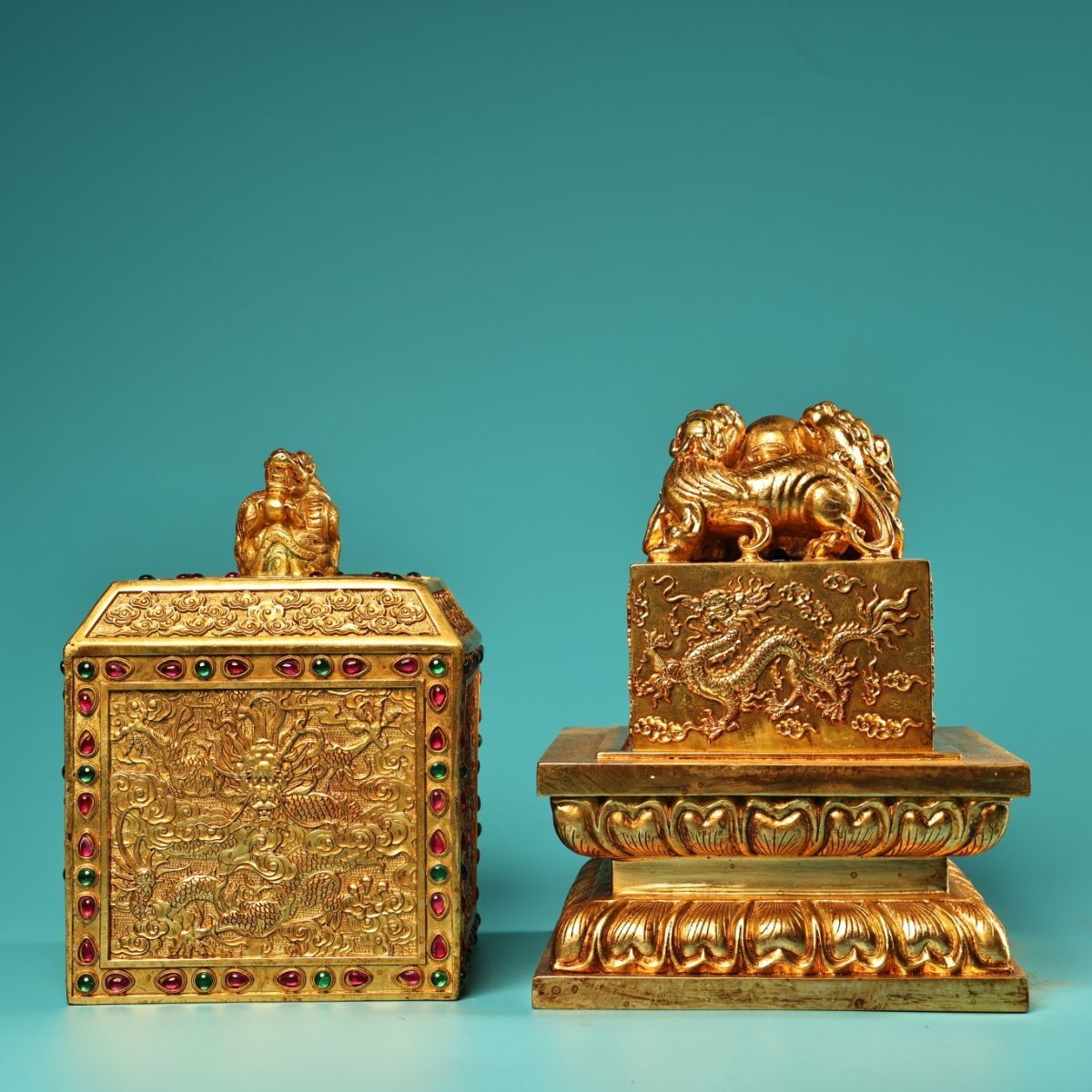 - 【永】清時代 古銅塗金 嵌寶石 瑞獸鈕盒 龍戲珠鈕印 印章 極細工 書道具 文房具 置物擺件 古美術品 時代物 古董品 収集 旧家蔵出 中国唐物