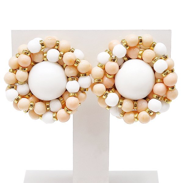 > DKG★送料無料★ ヴィンテージ ホワイト 白 ピンク ビーズ 花 フラワー デザイン アンティーク レトロ イヤリング 70