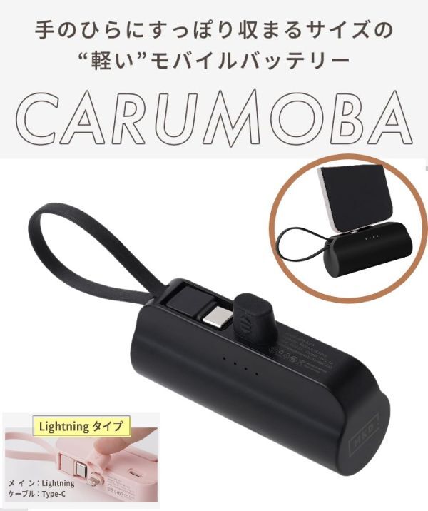 > CARUMOBA モバイルバッテリー ブラック 小型 軽量 PSE認証 iPhone ケーブル内蔵 直接充電 5000mAh Lightning type-c スタンド付き