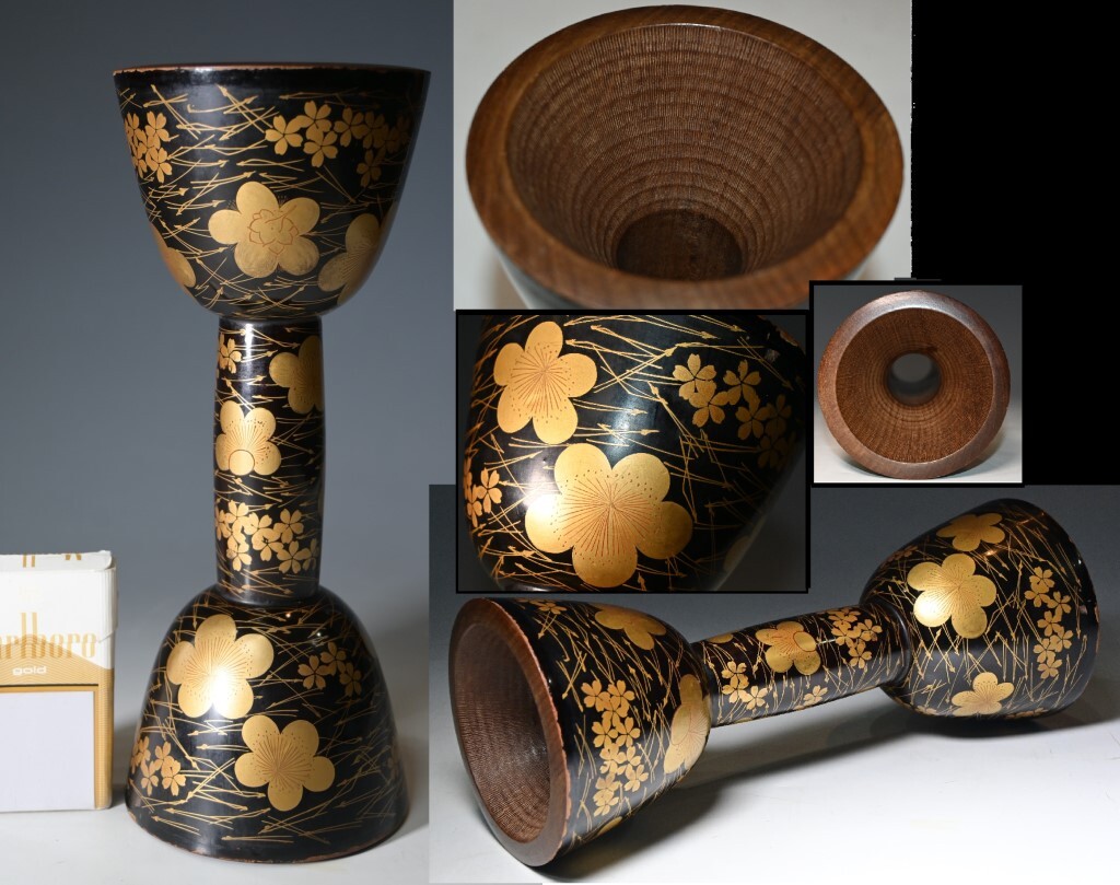 > 時代 小鼓 梅松桜蒔絵鼓胴 段鉋目彫 和太鼓 和楽器 黒漆 漆芸 太鼓 堤 打楽器 能楽 雅楽 伝統