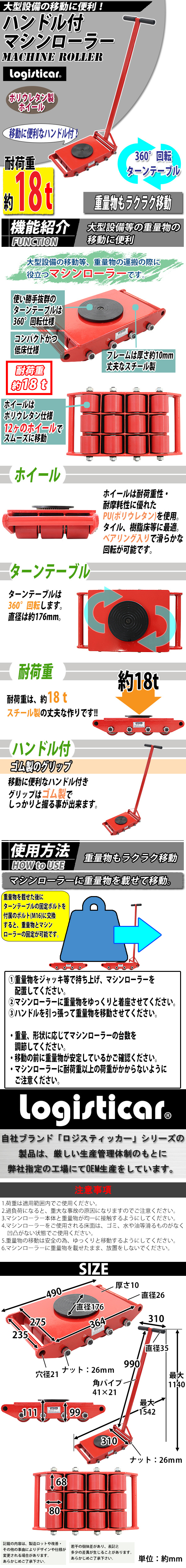 - 送料無料 マシンローラー 耐荷重約18t ポリウレタン製ホイール ハンドル付き 360° ターンテーブル 回転台 運搬ローラー