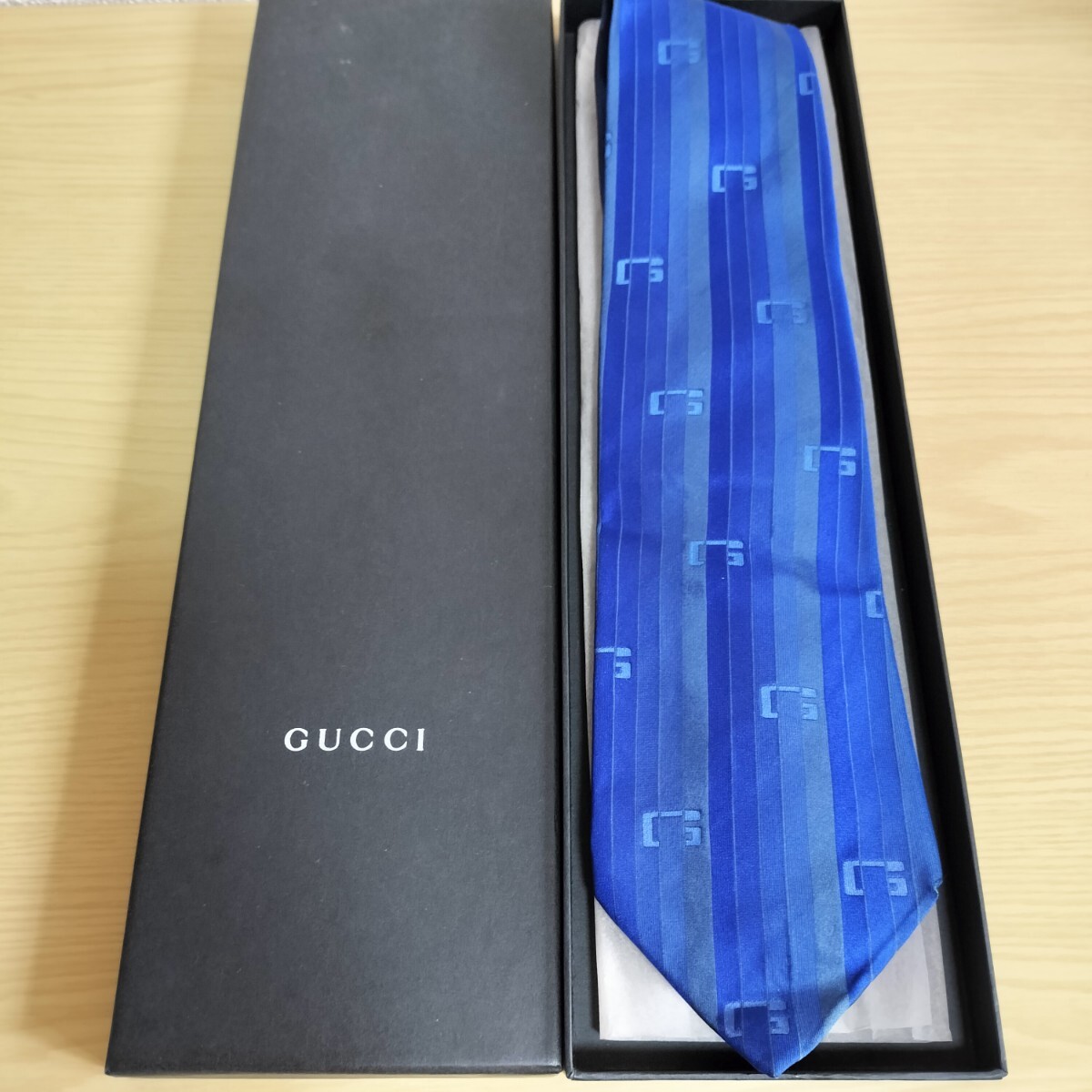 - グッチ(GUCCI)青色ラインGロゴ模様ネクタイ
