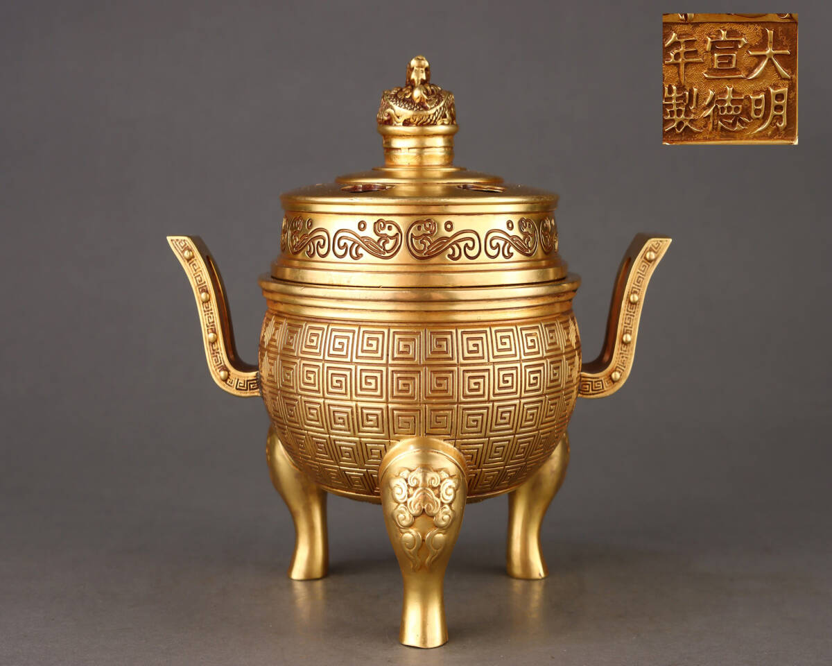 - ▽鴻▽明朝時代 古銅流金彫 回紋朝冠耳薫炉 双龍抱「大明宣徳年製」 時代物 中国古美術 骨董品