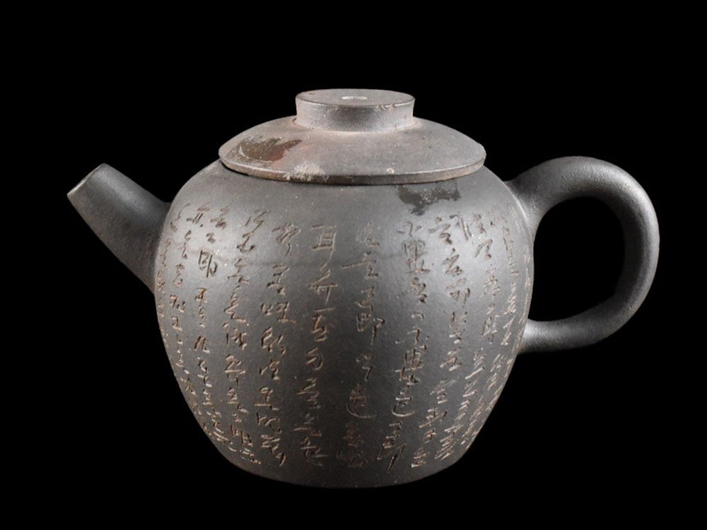 > 【雲】某名家委託品 中国古玩 朱砂 漢詩彫刻急須 高さ7cm 在銘 古美術品(茶器煎茶道具朱泥紫砂宜興)BY5633 UTUmnhg