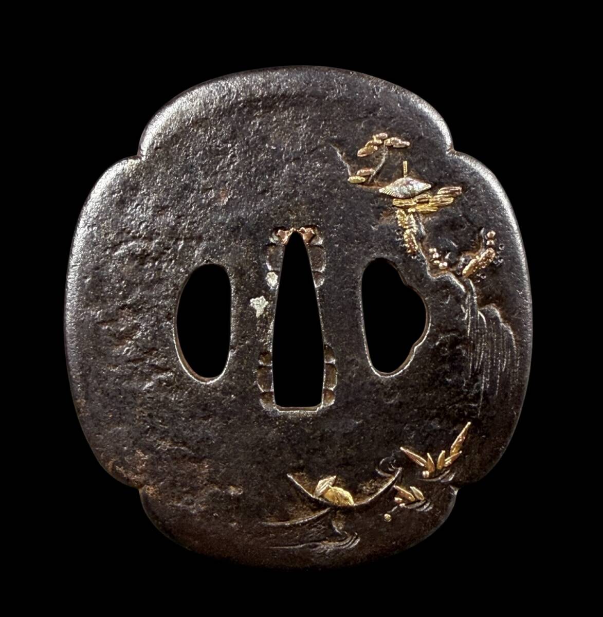 > 【偲】江戸時代 鉄地鐔 風景図 鍔 つば 居合用 日本刀装具 直径約7.4cm 重さ約127.89g r-1036