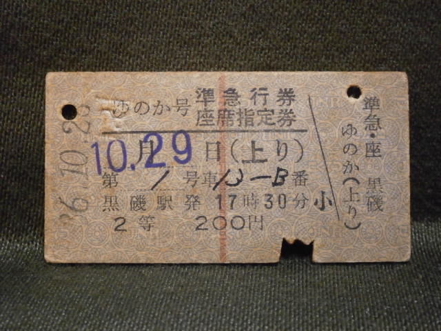 - 国鉄 2等 黒磯駅発行 ゆのか号 準急行券・座席指定券