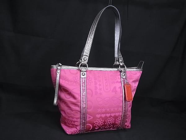 > 1円 ■美品■ COACH コーチ F15709 ナイロンキャンバス×レザー ハンドバッグ トート ショルダーバッグ 肩掛け ピンク系 FR6291