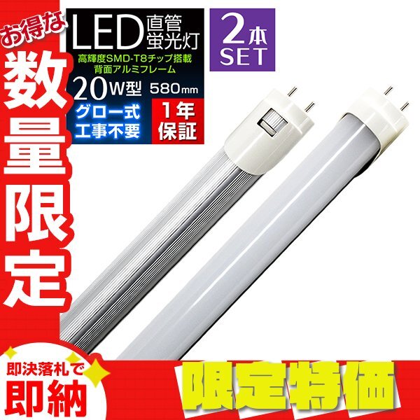 - 【限定セール 送料無料】2本セット 1年保証 直管LED蛍光灯 20W型 昼光色 580mm 約58cm グロー式 工事不要 SMDチップ LED 照明