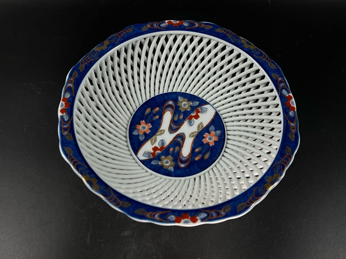 - 菓子鉢 染錦 透し 在銘 琴峰 峰之作 有田焼 色絵【博圓】径22.3cm