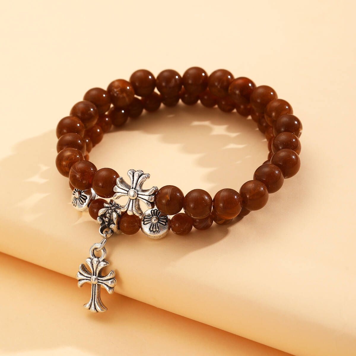 - S925ブラウンビーズクロスチャームブレスレット(16CM~22CM)2set 男女兼用