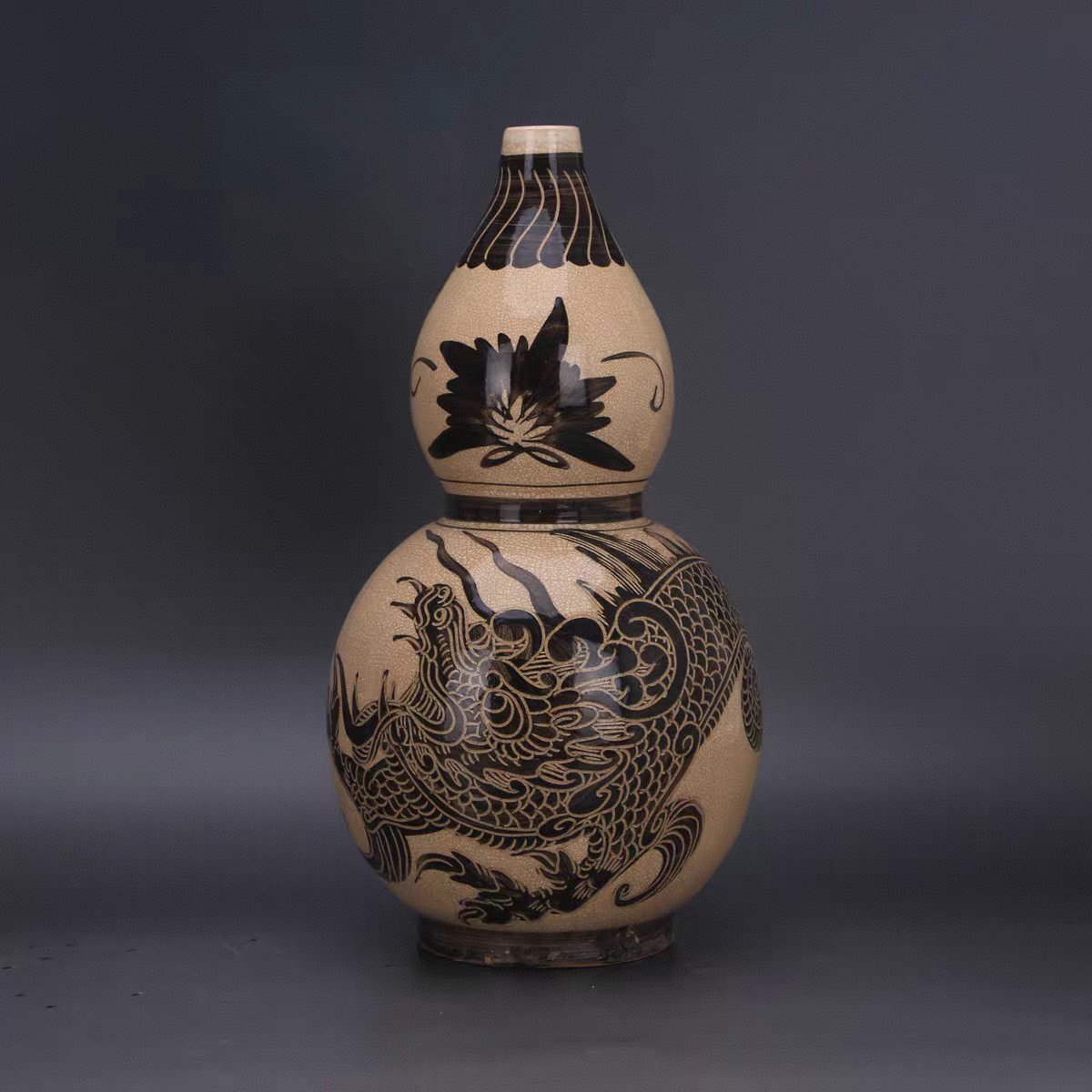 - 磁州窯 氷裂紋 彩絵 龍文様 瓢箪瓶 吉祥の調度品 陶器・景徳鎮 磁器 置物 装飾 収蔵 コレクション