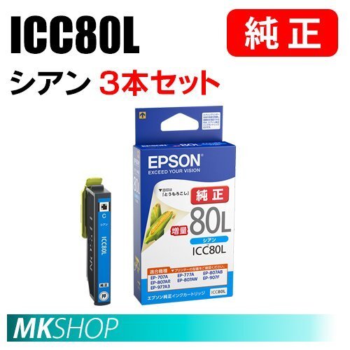 - EPSON 純正 インクカートリッジ ICC80L シアン 増量 3本セット(EP-808AR/808AW/907F/977A3/978A3/979A3/982A3)