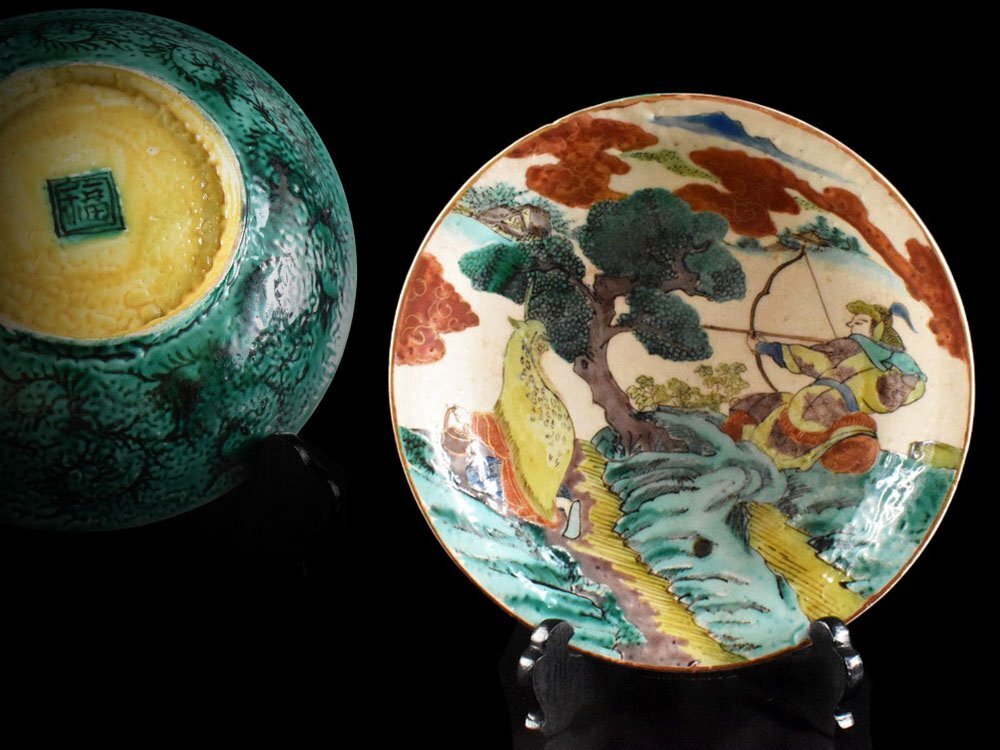 > 【雲】某資産家買取品 古九谷 色絵 武士 弓騎兵 皿 直径19.7㎝ 古美術品(青手 角福 吉田屋再興)AY6229 OTlkiu