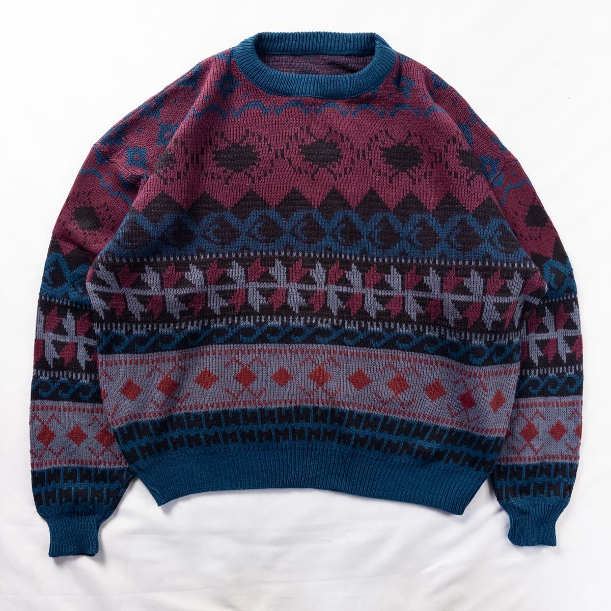> US Vintage 90s Unknown アクリル くすみカラー 幾何学模様 アート クレイジーパターン エスニック 民族 ボーダー 総柄 デザインニット