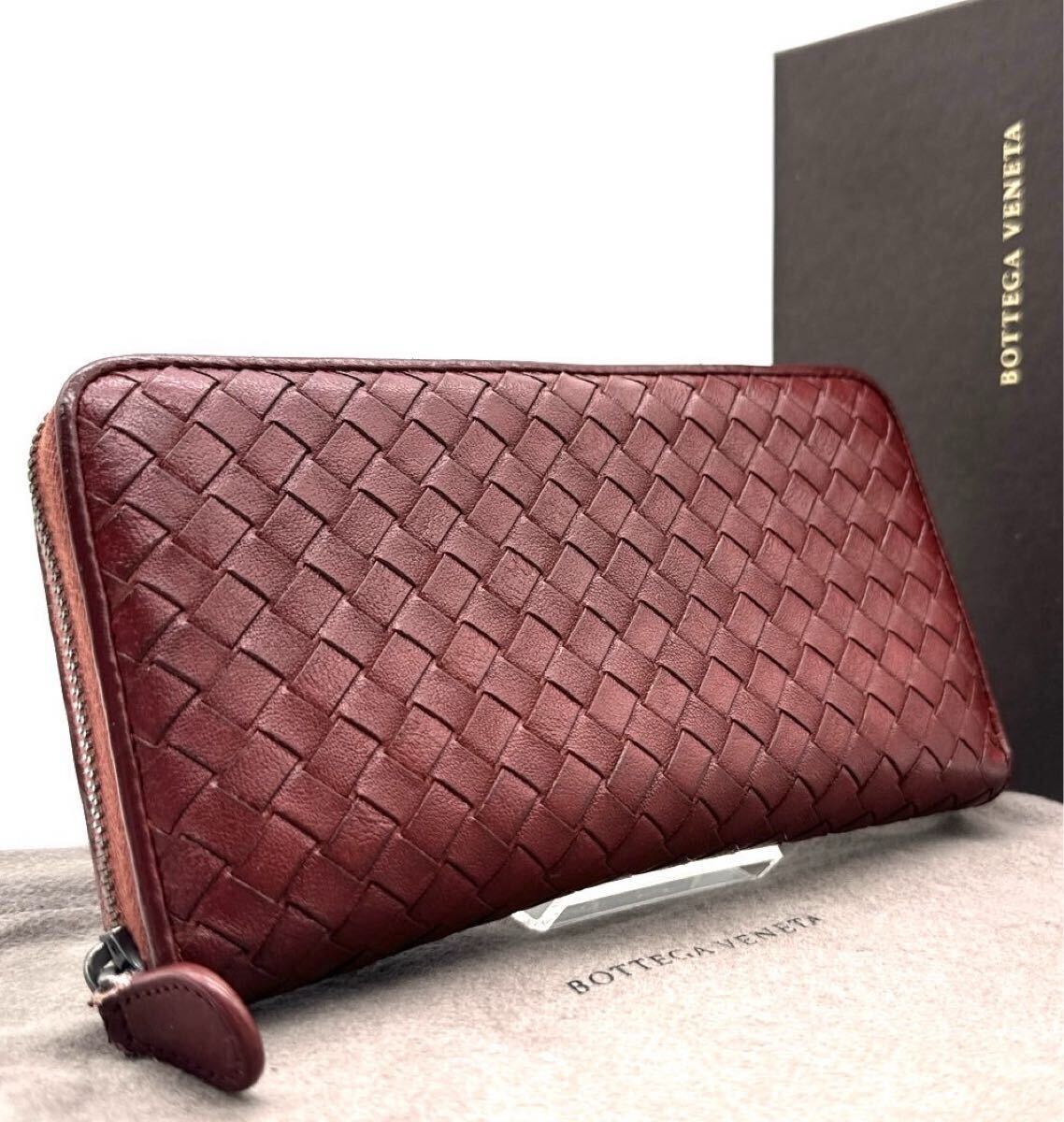 > 極美品◆BOTTEGA VENETA ボッテガヴェネタ 長財布 イントレチャート ラウンドファスナー ワインレッド 赤 ロングウォレット メンズ