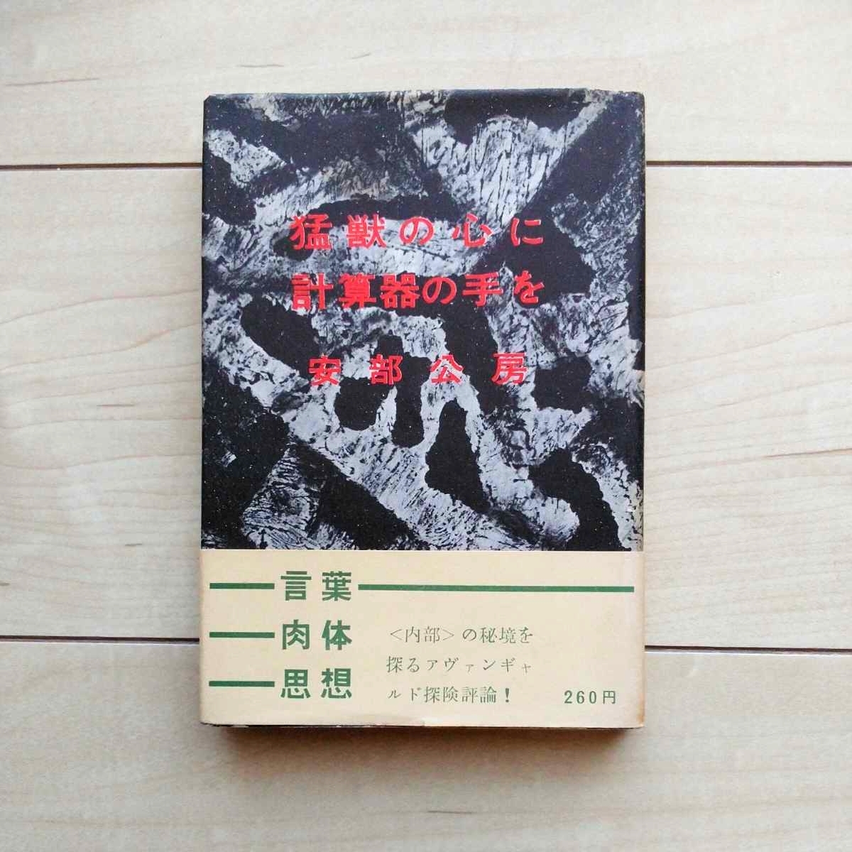 - ■第一評論集『猛獣の心に計算器の手を』安部公房著。装幀挿画安部真知。昭和32年初版カバー帯。平凡社発行。★帯背が経年劣化焼け。
