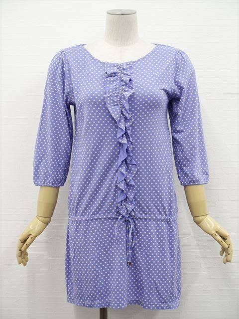 > 美品 マリクレールビス marie claire bis 洗える ひざ丈 パフスリーブ 七分袖 ラウンド ワンピース M 紫系地 黄系 ドット柄 【メール便可】