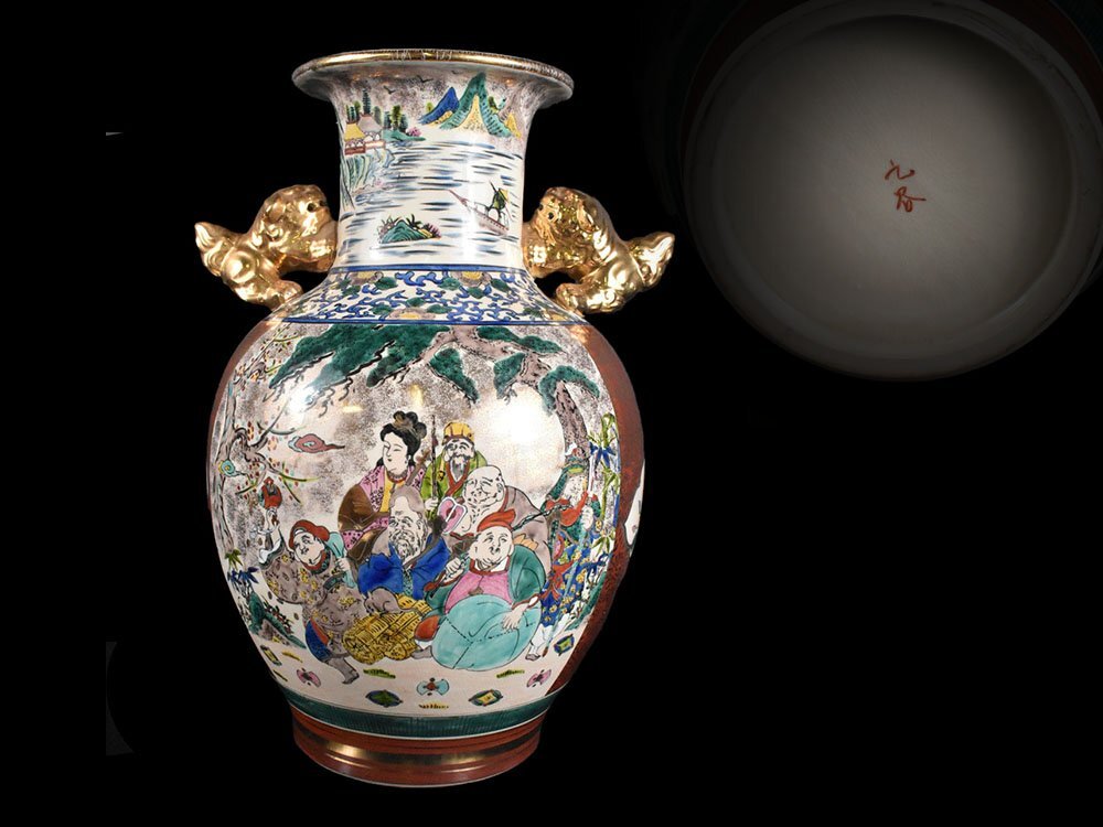 - 【雲】某資産家収蔵品 豪華 九谷幸仙 色絵金彩七福神楼閣山水細密絵付獅子耳付花瓶 飾壺 高さ50cm 古美術品(旧家蔵出)CJ1680 OTD7hed4