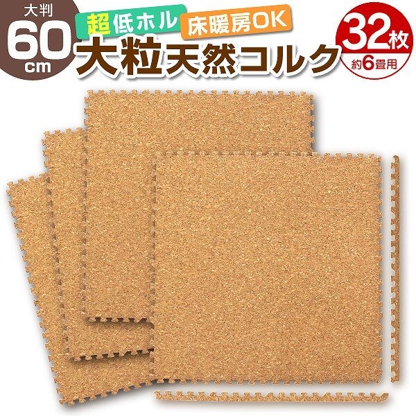 - 【32枚セット】コルクマット 大判 60cm 約6畳 ジョイント クッション マット サイドパーツ付き ノンホル PE素材 防音 断熱 床暖房対応